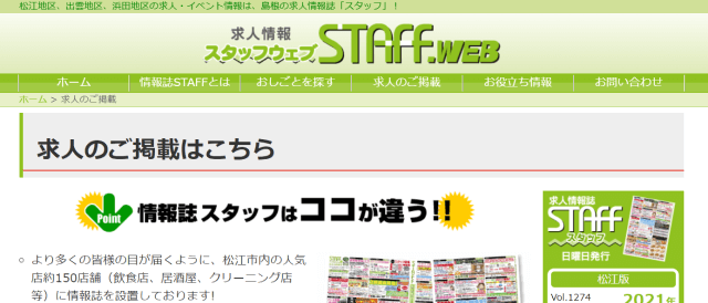 「求人情報スタッフウェブ」は、松江地区・出雲地区・浜田地区の求人を中心に取り扱っている求人サイトです。Webサイトだけでなく、松江市内の約150店舗に設置される情報誌にも求人が載るため、松江市内の求職者にアプローチしたい場合は特におすすめできます。情報誌には求人情報だけでなく店舗のPRも載せられるため、ブランディングにも最適です。