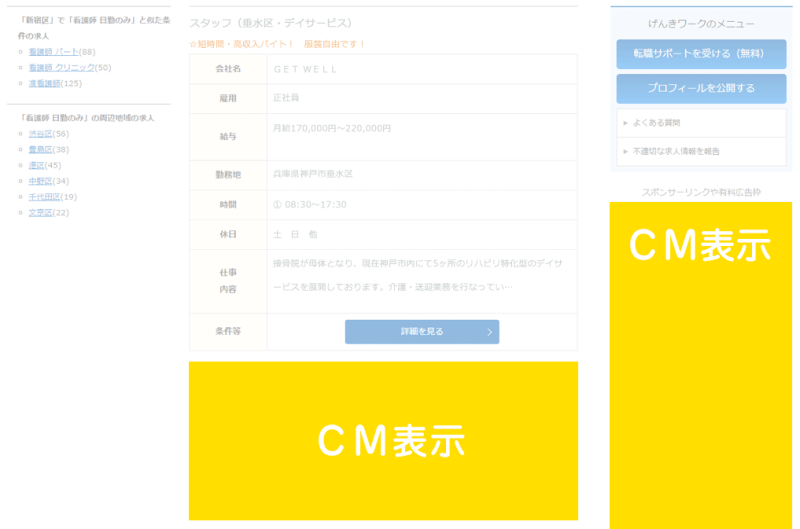 無料掲載が実現している理由は、次の画像のように、サイト内に広告(CM)を出したい企業から収入を得ているからです。