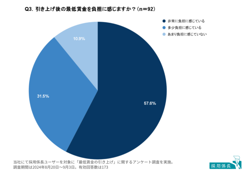 引き上げ予定の事業所へ、引き上げ後の最低賃金額を負担に感じるかどうかについて質問したところ(n=92)、57.6%が「非常に負担に感じている」と回答しました。