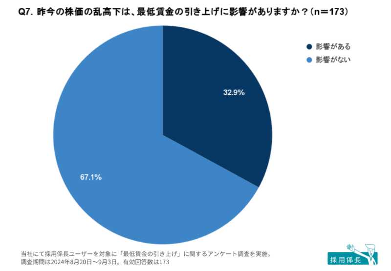 すべての事業所へ、昨今の株価の影響について質問しました(n=173)。 「影響がある」と回答したのは32.9%。現状では、「影響がない」事業所が多数を占めています。