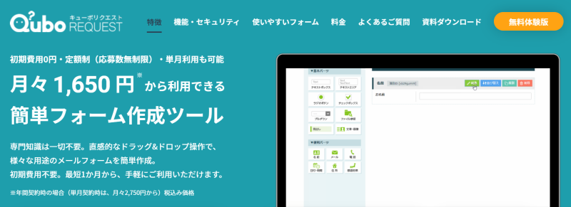 直感的に作成可能なフォームツールです。無料プランはありませんが、14日間の無料体験期間があり、機能や動作性を試すことができます。また、専任のカスタマーサポートがついてくれるため、不明点を確認しやすくなっています。