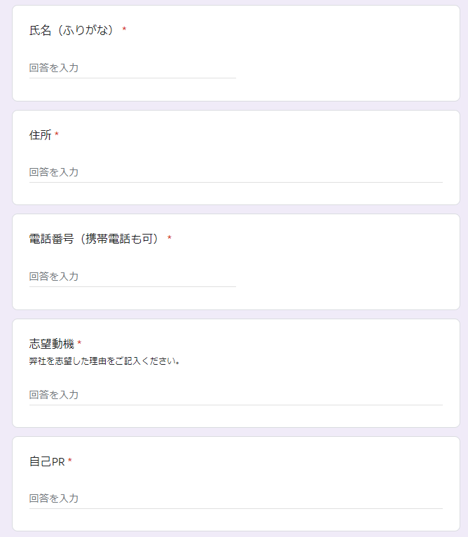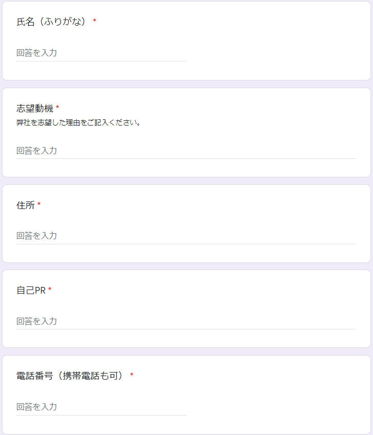 設問に対して適切な入力形式を設定することも大切なポイントです。すべての項目をテキスト入力にするのではなく、例えば希望職種はラジオボタンから選べるようにする、住所の都道府県はプルダウンで選択できるようにするなど、なるべく応募者の手間を減らすように工夫しましょう。