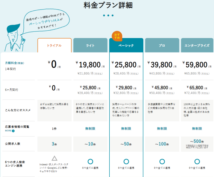 ベーシックプランなら月19,800円で50件まで求人情報を作成でき、求人の効果測定や求人一覧の検索機能なども利用できるようになります。後はここで作成した求人ページをIndeed(インディード)広告に掲載して運用するだけです。