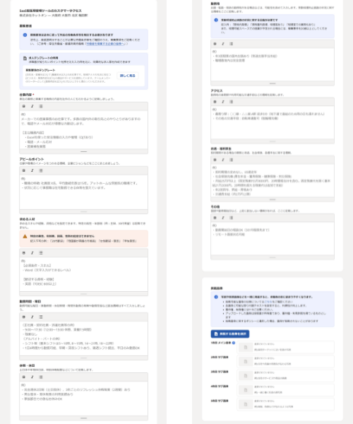 必須項目が”仕事内容”だけとなっているのですが、求人票をより多くの求職者に見てもらいたい場合は、全ての項目を記入するようにしてください。