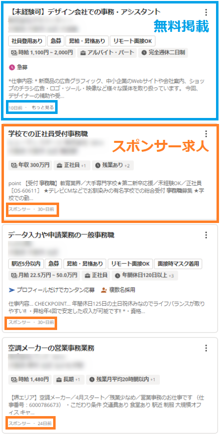 - Indeedは無料で掲載できますが、露出を増やしたいときにスポンサー求人と呼ばれる有料の広告を出すことができます。