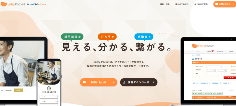 「EntryPocket」は、マイナビが運営するアルバイト・パート採用に特化した採用管理システムです。 SEO対策が施された採用サイトを制作することで、検索者からの応募率アップを図ります。求人情報版の検索エンジンと自動連携するため、広告の閲覧数増加に取り組めます。 また、20媒体以上の応募者情報を自動取り込みできるので、応募者情報を一元管理できます。 初期費用:要問合せ 月額料金:要問合せ |
