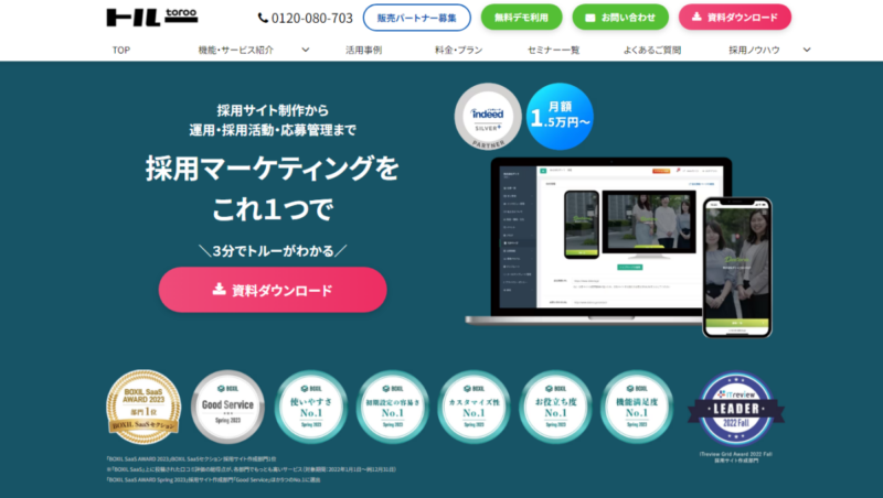 「トル―」は、専門知識が必要なく採用サイトが制作できる採用管理システムです。 Indeedをはじめ、求人ボックス、Googleしごと検索とも連携しているので、求人情報をより多くの人に閲覧してもらえる可能性があります。 オプションで、専属のライターによる客観的な視点で、記事代行も行ってもらえます。 月額料金:16,500円~ 初期費用:100,000円~ |