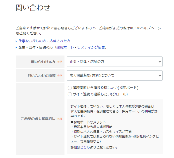 また、採用ボードの利用や有料掲載について気になることがある場合も、上記の問い合わせフォームから申請できます。採用ボードに新規登録する場合は下記ページから入力を進めることになります。