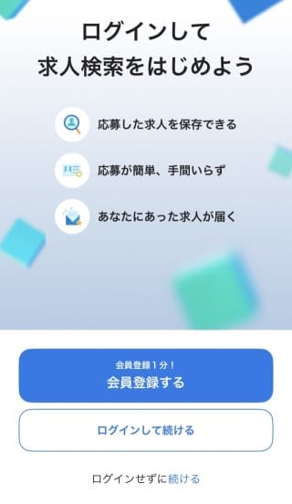 アプリをひらくとアカウント登録画面(会員登録)が表示されます。登録しなくても求人は閲覧できますが、会員登録することで応募が簡単になりますし、求人がメールで届くので、より効率的に就職活動したい場合におすすめです。