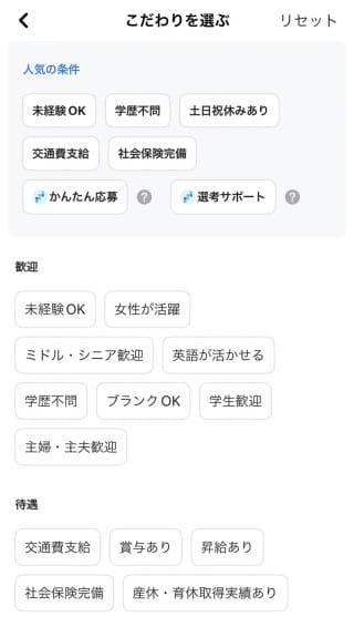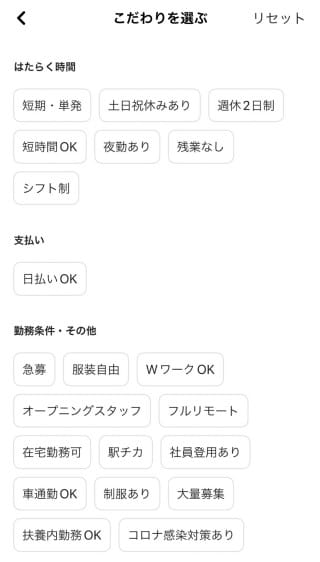 求人検索画面では「こだわり」を選ぶことで、上記の写真のように自分のニーズに応じて詳細の条件を設定できます。「在宅ワークがしたい」「未経験でもできるお仕事がいい」といった多様なニーズに応え、ひと手間でマッチ度の高い求人を表示することが可能なのです。