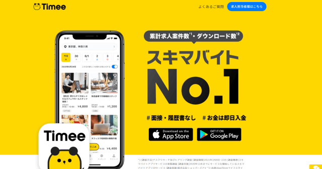 スキマ時間で探せるサービスの中でも、特にメジャーなのがタイミーです。