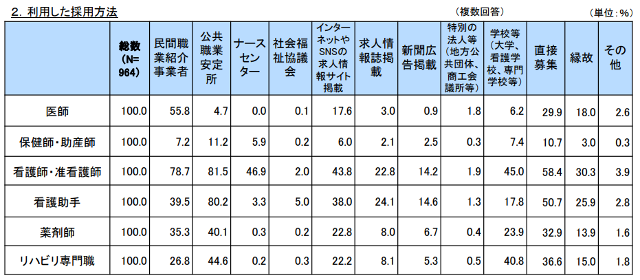 2019年に厚生労働省が全国約8,400病院に対して行った調査では、看護師の採用方法は公共職業安定所(ハローワーク)がもっとも多く、それに続くのが民間職業紹介事業者でした。