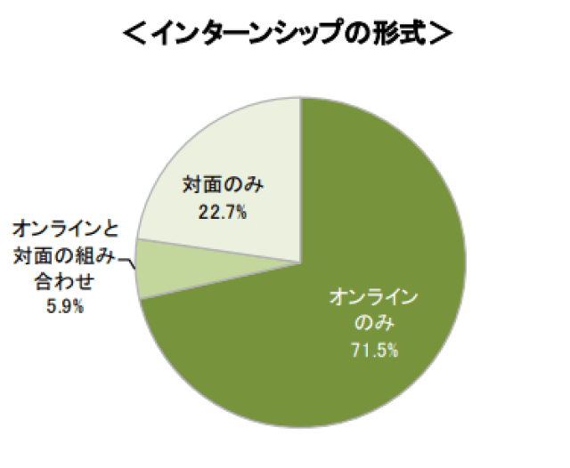 「オンラインのみ」「オンラインと対面の組み合わせ」の合計は77.4%であり、多くの企業がオンラインインターンシップを実施していると分かります。「オンラインのみ」の回答割合だけでも7割を超えており、コロナ禍におけるインターンのスタンダードになっているといっても過言ではありません。