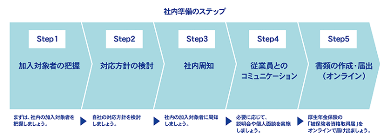 社会保険の適用拡大に対応するためには、下記の流れで準備を進めることが効果的です。