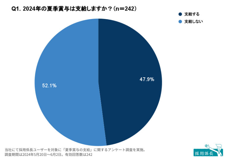 はじめに、2024年の夏季賞与の支給予定について質問したところ、47.9%の事業所が「支給する」と回答。「支給しない」事業所が過半数を占めることが明らかになりました。