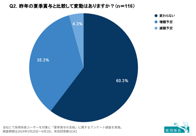続いて、Q1で夏季賞与を「支給する」と回答した事業所(n=116)へ、昨年の夏季賞与からの変動について質問しました。