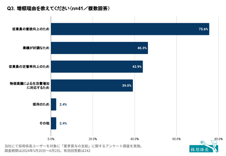 Q2で夏季賞与を「増額予定」と回答した事業所(n=41)へ、増額理由について質問したところ、「従業員の意欲向上のため」がもっとも多く、75.6%の事業所が回答しました。