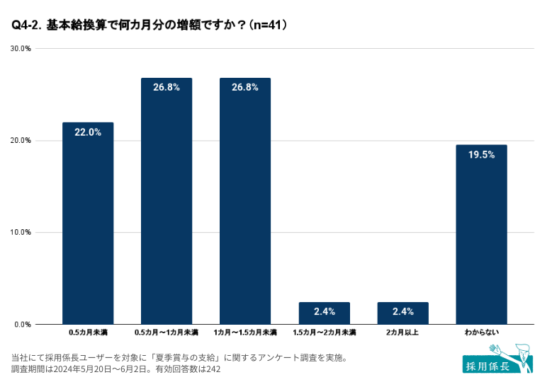 「0.5カ月~1カ月未満」および「1カ月~1.5カ月未満」が同率で他の支給月数を上回っています。半数以上が0.5カ月~1.5カ月未満の範囲で増額することが分かりました。