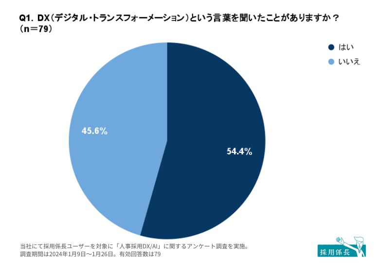 はじめに、DXという言葉を聞いたことがあるかどうかについて質問したところ(n=79)、「はい(=聞いたことがある)」と回答した事業所は54.4%でした。