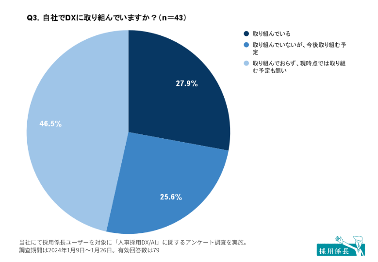 Q1で「はい」と回答した事業所へDXの取り組みについて質問したところ(n=43)、「取り組んでいる」は27.9%、「今後取り組む予定」は25.6%です。