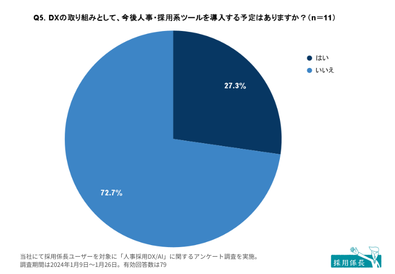 Q3で「取り組み予定」と回答した事業所へ、DXの取り組みとして人事・採用系ツールを導入する予定があるかどうかについて質問したところ(n=11)、「ある」と回答した事業所は、27.3%に留まりました。