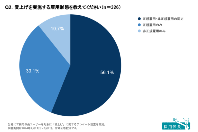 続いて、賃上げを実施する雇用形態について質問したところ(n=326)、「正規雇用・非正規雇用の両方」と回答した事業所が56.1%を占めました。