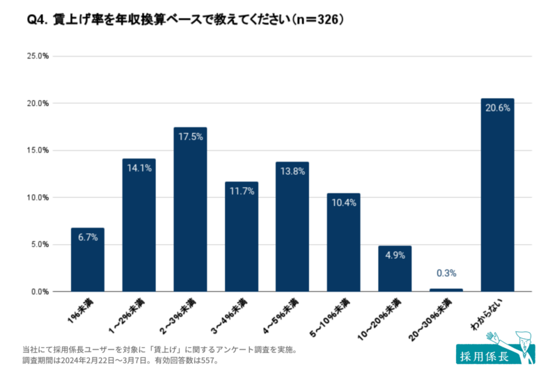 賃上げ率について質問したところ、もっとも多かったのは「2~3%」です。次に「1~2%」、「4~5%」が続きました。