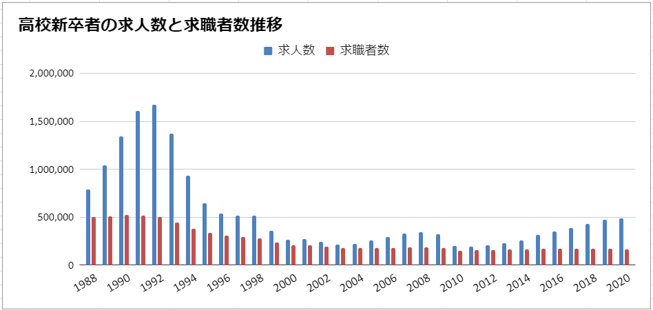 グラフを見ると、大学へ進む学生が増えたことや少子化による影響が如実に現れており、1990年に約52万人いた求職者の数は2020年時点で約17万人にまで減少。