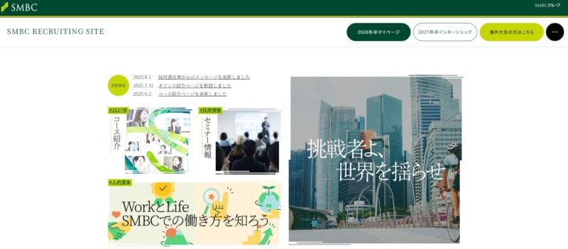 三井住友銀行の採用サイトは、「挑戦者よ、世界を揺らせ」という力強いメッセージを前面に打ち出した、ダイナミックなデザインが特徴です。コーポレートカラーの緑を効果的に使い、社員の生き生きとした写真や、未来に向けた挑戦を想起させるビジュアルで構成されています。