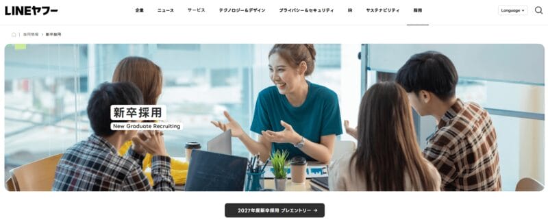LINEヤフーの新卒採用サイトは、白を基調としたミニマルでクリーンなデザインが特徴です。
