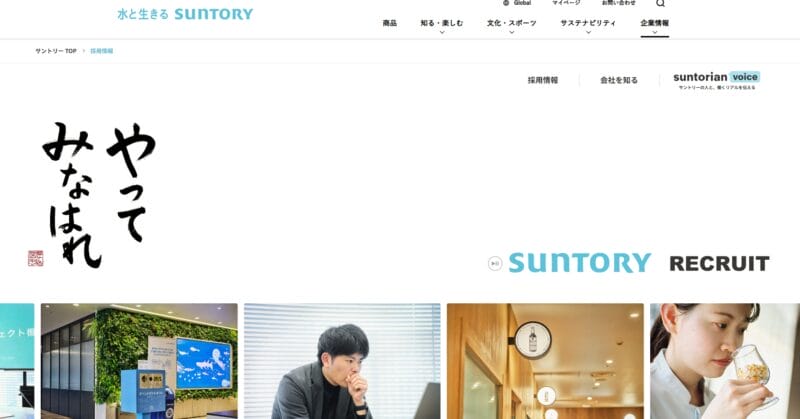 「やってみなはれ」という言葉とともに、社内の働く様子が流れる採用サイト。白の背景カラーをベースにすることで、見やすさを確保しながら、清潔感と活気のある印象を与えています。
