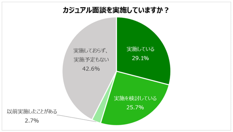 就職・転職情報サービスを展開している株式会社学情様の調査では、4社に1社以上がカジュアル面談を実施しており、検討中も含めると全体の半数以上にのぼります。