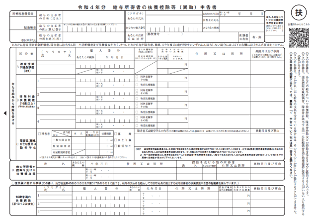 控除内容を確認するために入社時に配布する書類が、「給与所得者の扶養控除等(異動)申告書」です。