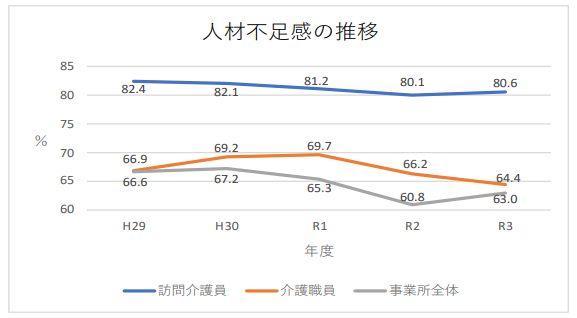 6割以上の事業所が人手不足を感じていることが分かります。