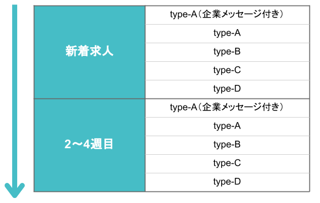 type内の検索結果に表示される求人票の順位は、新着求人(掲載開始から1週間以内の求人)が優先です。新着求人の中では上位プランから順に表示され、同じプランの中においては日々ランダムで表示順が変わります。