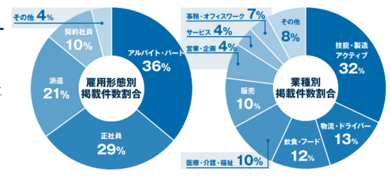 業種別に見ると、「技能・製造・アクティブ」の求人が豊富で、「物流・ドライバー」「飲食・フード」「医療・介護・福祉」「販売」などの求人も多いと言えます。
