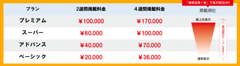 掲載料金が高いプランを選ぶほど掲載順位が高く、サイトの上のほう(目立つ位置)に求人が掲載される仕組みです。